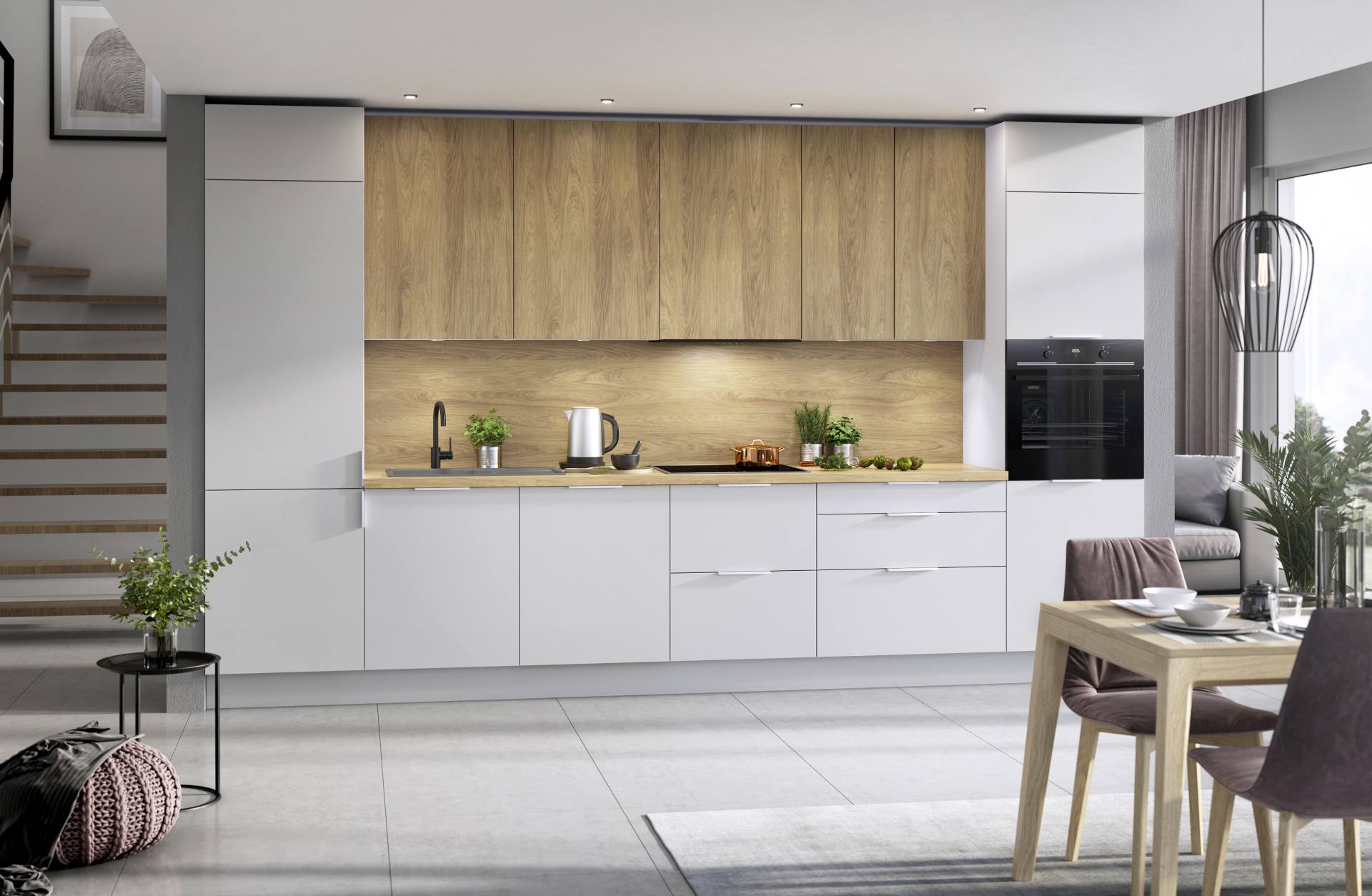 Urządzenie małej kuchni jest nie lada wyzwaniem. Wymaga dobrze przemyślanych decyzji i praktycznych rozwiązań, które pozwolą optymalnie ją zabudować i wyposażyć. Pomysły na aranżację muszą iść w parze z rozsądnym zagospodarowaniem przestrzeni, jaką dysponujemy. Kiedy liczy się każdy centymetr, trzeba efektywnie go spożytkować. Gdzie szukać dodatkowego miejsca, którego tak bardzo brakuje we wnętrzach o niewielkim metrażu ? Najpierw pod sufitem. To całkiem spory zapas powierzchni do przechowywania. Dzięki szafkom do wysokości sufitu nie marnujemy miejsca, ponieważ zabudowując ścianę nie tylko w szerz, ale i na wysokość, wykorzystujemy cały dostępny potencjał. Dodatkowy bonus takiego rozwiązania? Zabudowa do wysokości sufitu nie tylko więcej pomieści, ale prezentuje się atrakcyjnie wizualnie.